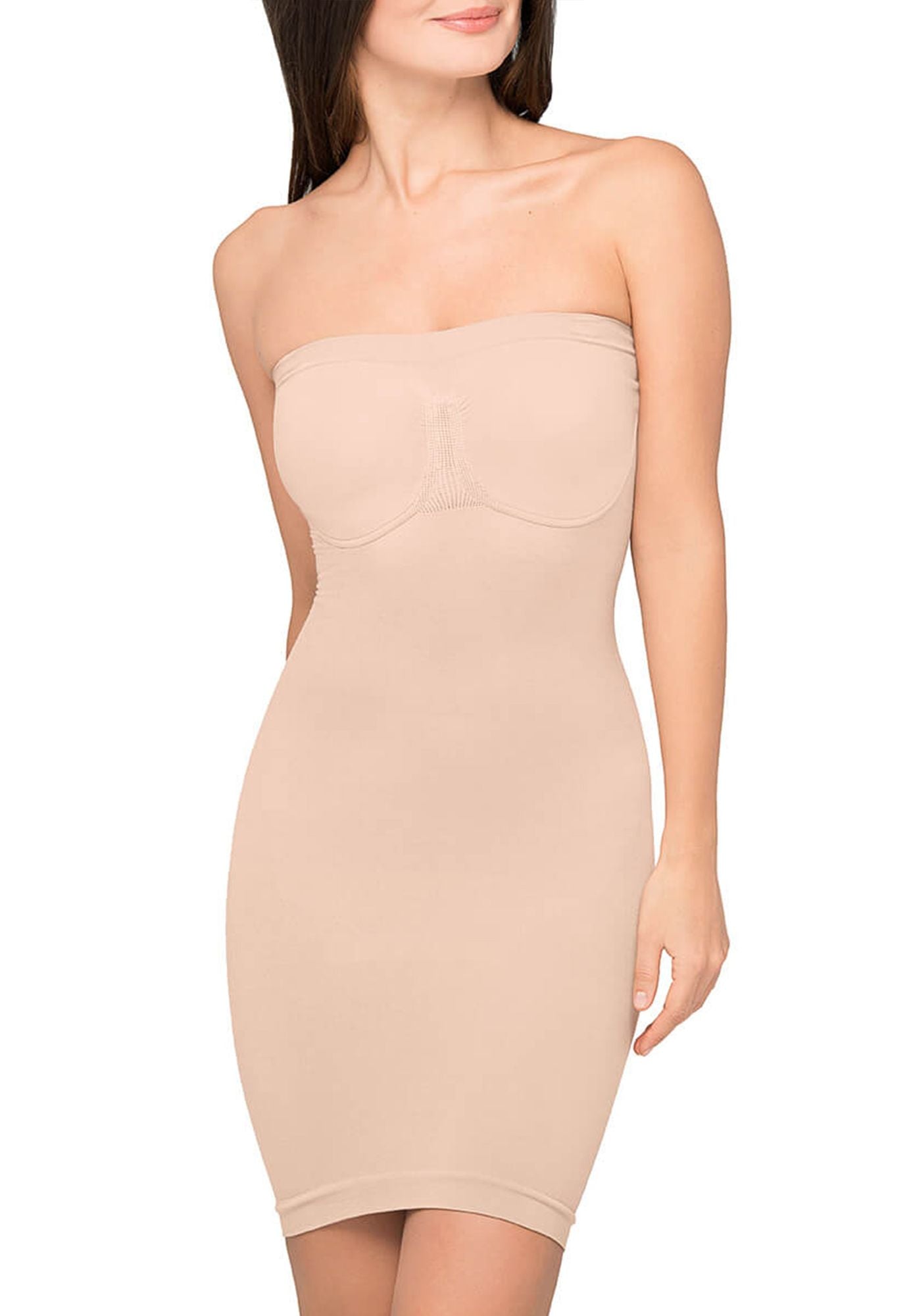 Dieses Miederkleid sorgt für eine schmeichelnde Silhouette - keine unschönen Röllchen mehr und Dank einer sicher haftenden Gummierung auch ohne Träger mit zuverlässigem Sitz.